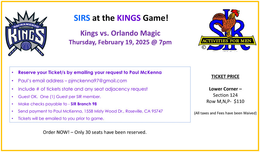 These are “one of a kind outings” happening during the year. River Cats baseball game, Sacramento King’s basketball game, the California Aerospace museum with a DaVinci machines exhibit, and a historic brewery tour have been some of our recent outings.